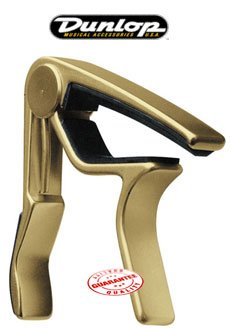 Dunlop Trigger Curved Gold Guitar Capo 83CG. When they made the Dunlop Trigger Curved Guitar Capo they knew your sound shouldn't change when you put on a capo and it shouldn't be a 12-step process either. With the Trigger capo you'll come through loud clear in tune and in less time. The Dunlop capo is made of aircraft-quality aluminum with a strong padded spring-action grip that can be changed quickly with just a squeeze. Works for both 6- and 12-string guitars. The Trigger Curved Capo features a unique pressure pad that conforms to fingerboard and frets for buzz-free fretting.